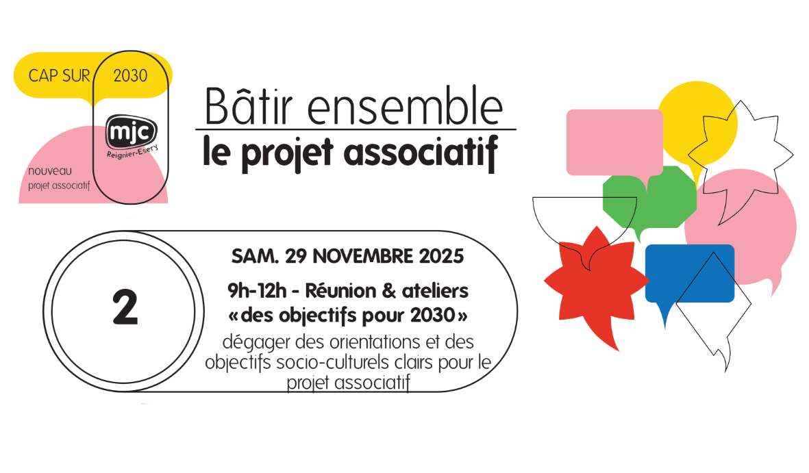 Le projet associatif structure les actions en fixant priorités et moyens pour 5 ans. En 2025-26, la MJC doit établir un nouveau projet associatif 2026-2030 et souhaite associer le plus grand nombre dans le travail de réflexion et d’élaboration de ce projet à travers 3 rendez-vous. Participez !